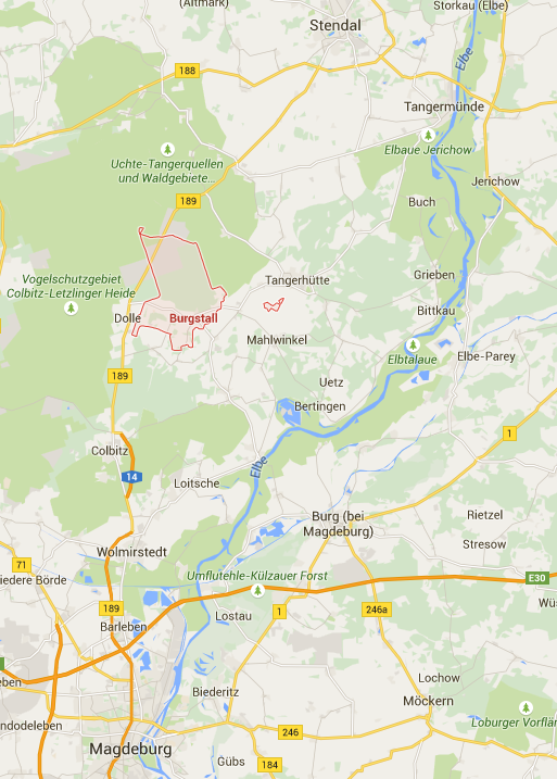 Vom Ort Burgstall aus führen Landstraßen nach Dolle an der Bundesstraße 189 (Magdeburg–Stendal), nach Tangerhütte sowie nach Angern/Rogätz. Der nächste Bahnhof befindet sich in dem 7 Kilometer entfernten Ort Mahlwinkel an der Strecke Magdeburg–Wittenberge. Die Altmark-Autobahn von Magdeburg nach Schwerin (im Bau) wird nahe Burgstall vorbeiführen und über eine eigene Anschlussstelle zwischen Dolle und Burgstall verfügen.